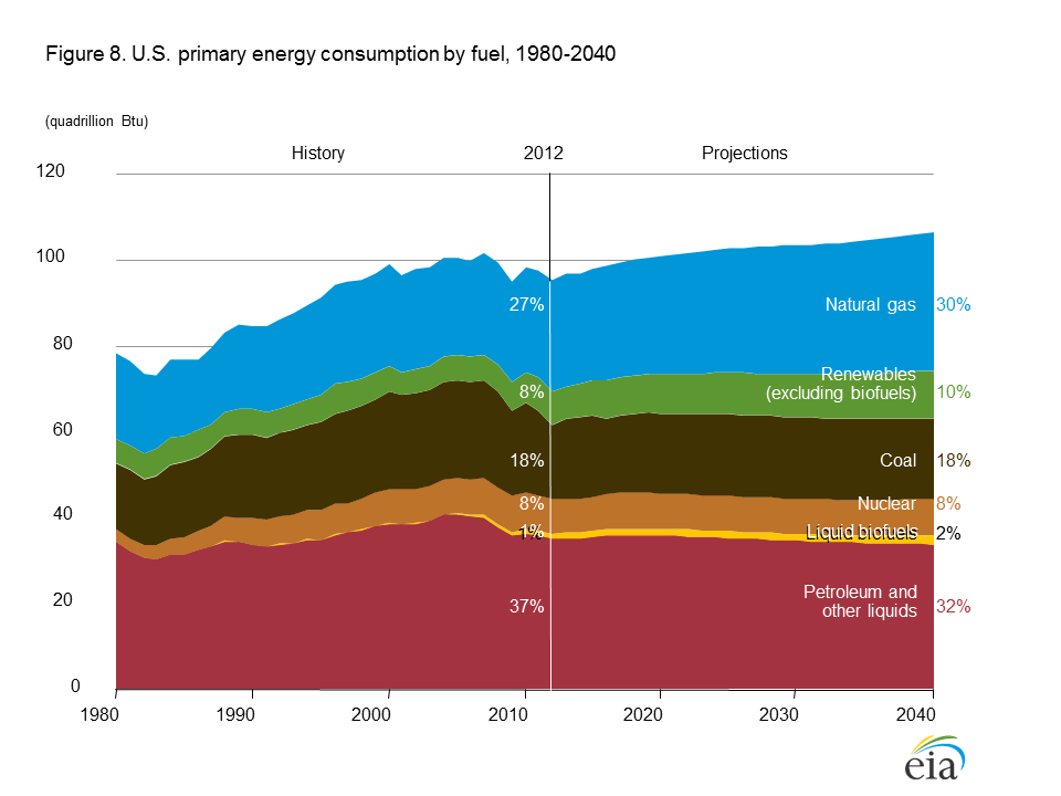 eia-aeo2014-forecastAEO2014 forecasts that total energy consumption in the United States will rise modestly during the next 25 years and that the percentage of energy provided by renewable resources in the United States will increase from 9 percent to 12 percent by 2040 (an increase of 33%). Put into perspective, increasing the use of renewable energy by the amount projected by AEO2014 would only reduce U. S. dependence on fossil fuels from 82 percent to 80 percent of total energy consumed by 2040.  If EIA’s current projections are remotely accurate, we will certainly not enjoy the elimination of fossil fuels before mid-century.